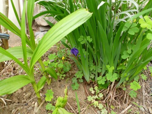 ま~雨が 降る前に・・ 散策会!! 三寸あやめ カタバミ (すっぱすっぱ) と比べれば 小ささは分るが 3寸 と言うより 20センチ ま~倍だ こっちは 巨大 三つ葉 でかい!! 放射能の 影響か!!・・ははh でかい種類で 種を取ると言ってる 自宅のテッセ…